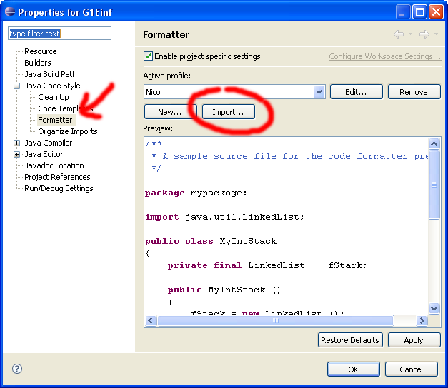 Unter der Rubrik Java Code Style->Formatter klicken sie Import und wählen die Formatter-Datei aus.